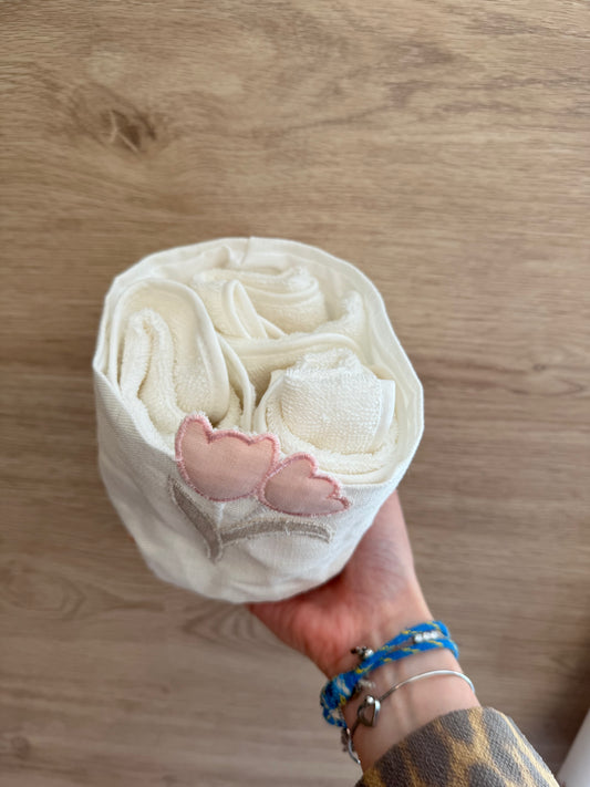 Cestino in tessuto lino con tulipani e 3 lavette