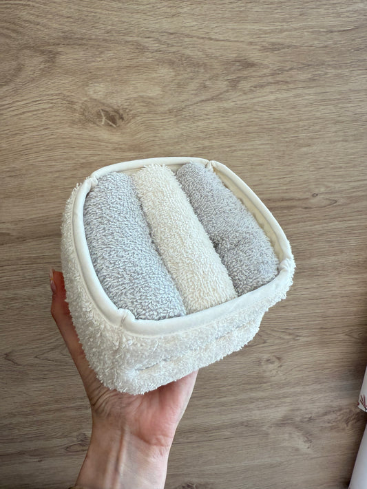 Cestino in spugna con ricamo e 3 lavette