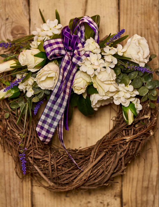 Corona con rami di legno rose bianche e lavanda - 38 cm