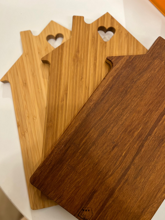 Tagliere a forma di casetta con cuore in legno di bambù tinta caramello