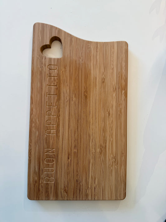 Tagliere con cuore e scritta "Buon Appetito" in legno di bambù tinta caramello