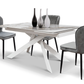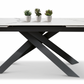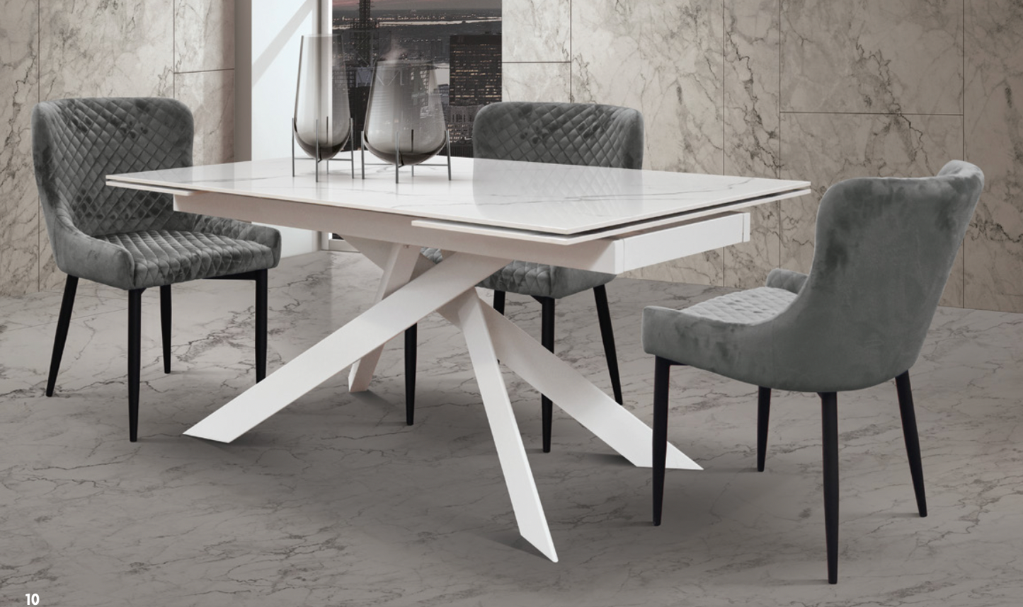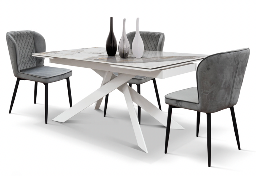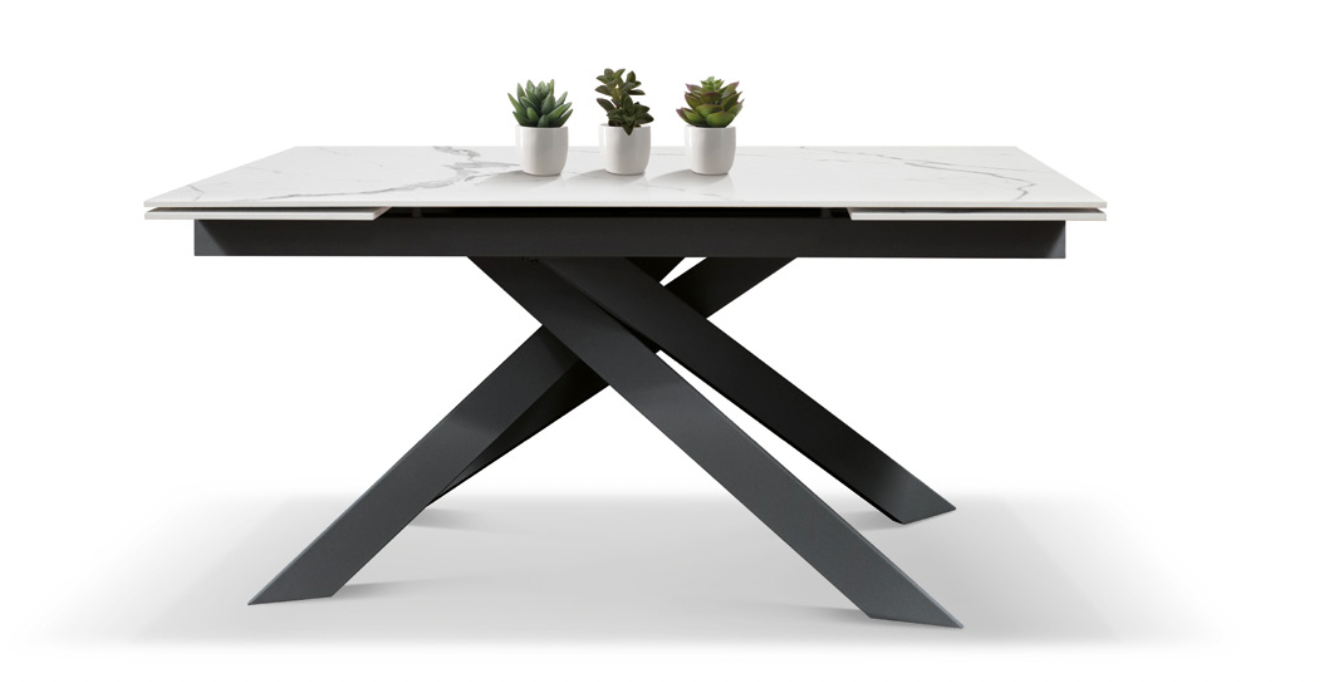 Tavolo con due allunghe laterali ciascuna da cm. 40 con top vetro ceramica in finitura bianco calacatta e gambe moderne in metallo bianco o in metallo nero. Belmont è un tavolo di design e moderno, ideale per rendere unica la tua casa.