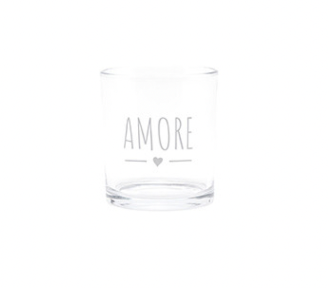 Bicchiere in vetro borosilicato con scritta "Amore" e cuoricino. Ideale per donare un tocco di romanticismo alla tua tavola e alla tua giornata.