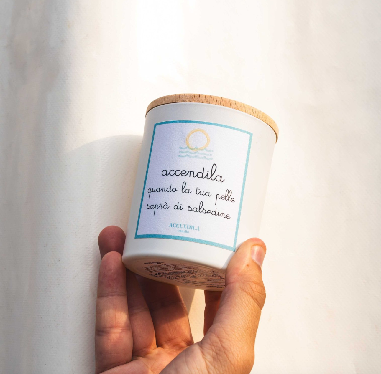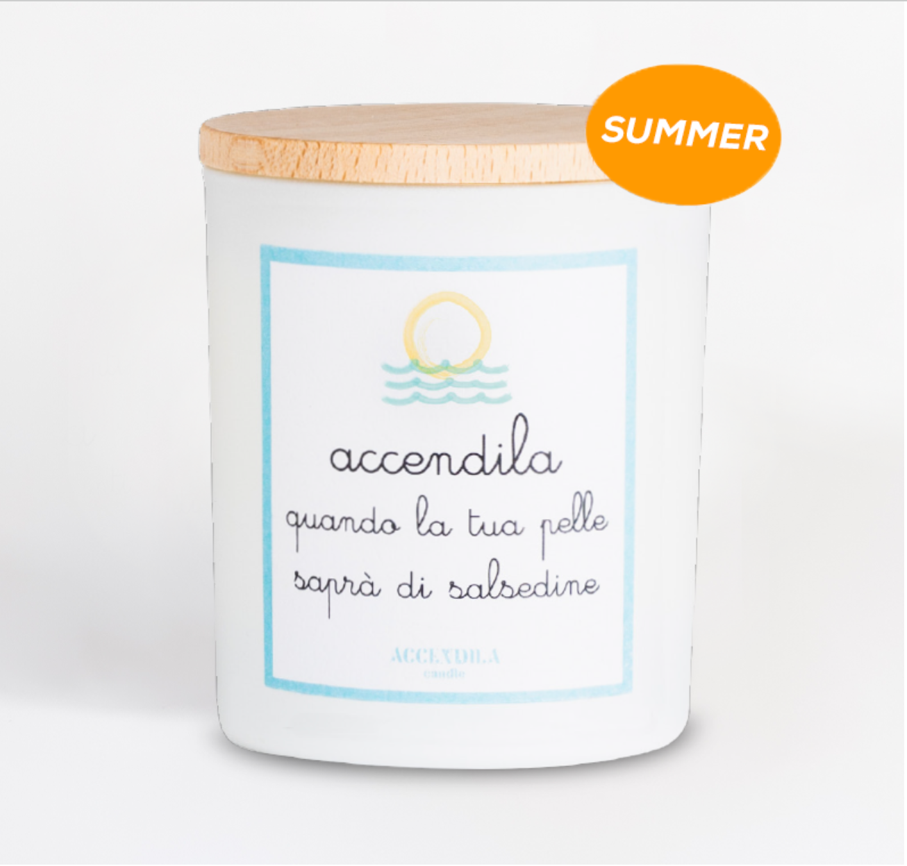 Candela profumata "Accendila quando la tua pelle saprà di salsedine. La candela è realizzata con 100% cera di soia naturale, il barattolo è in vetro satinato bianco riutilizzabile e tappo in legno di faggio.
