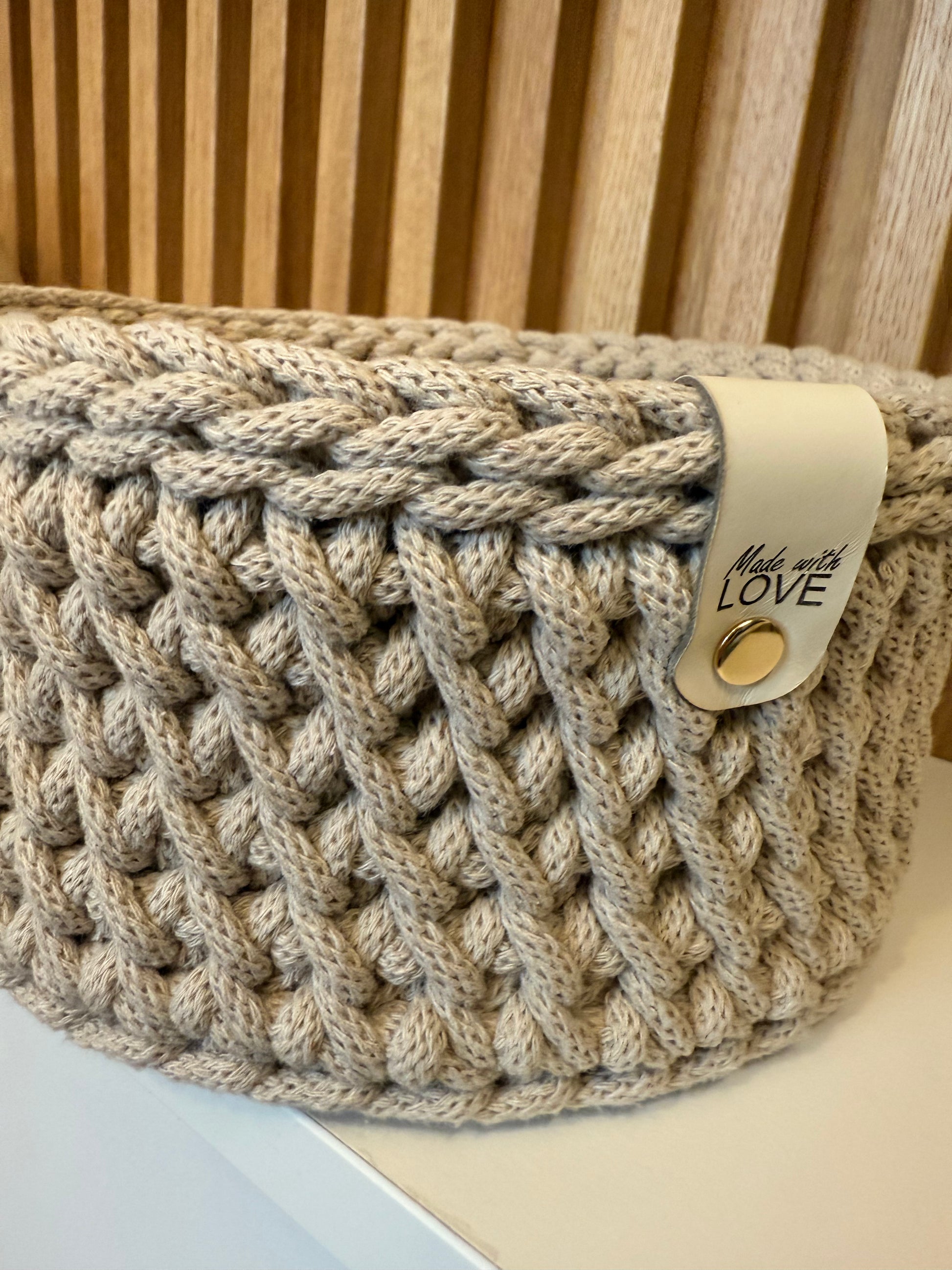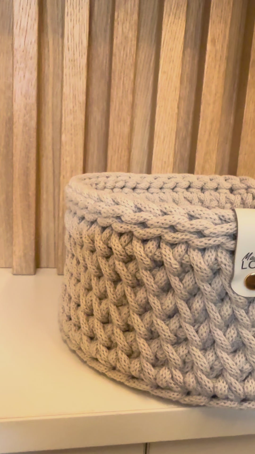 Cestino con base in legno e realizzato con corda intrecciata in 100% cotone da 5 mm color tortora. Il cotone è certificato OEKO - TEX e realizzato interamente a mano con cura e passione. Ogni cestino è un pezzo unico, lavorato all’uncinetto con filati morbidi e delicati, perfetto per donare un tocco romantico e artigianale ad ogni angolo della tua casa, ideale in bagno come organizer, in tavola per riporre il pane, in camera da letto.