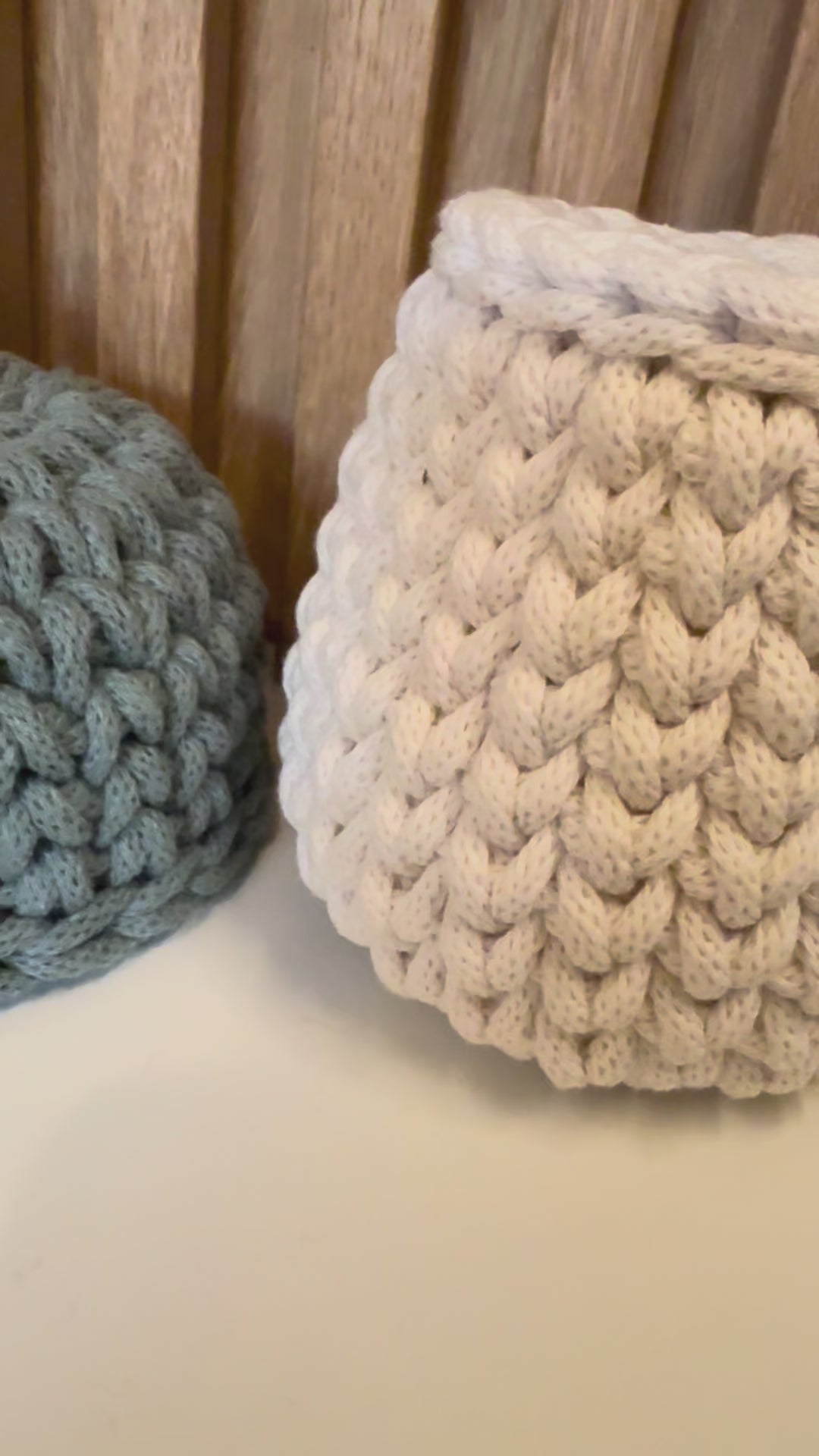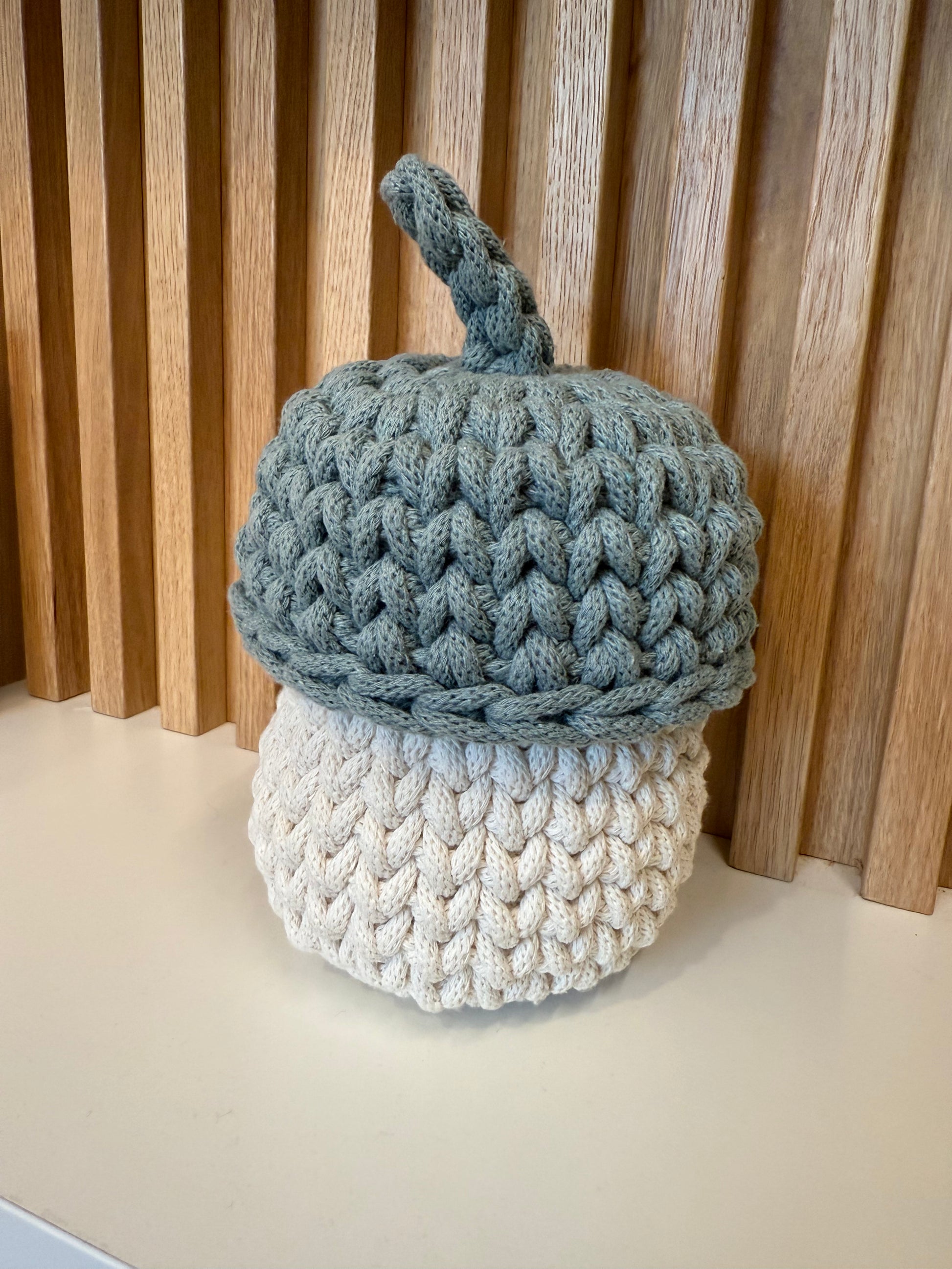 Contenitore a forma di ghianda realizzato con corda intrecciata in 100% cotone da 5 mm color panna e verde acqua. Il cotone è certificato OEKO - TEX e realizzato interamente a mano con cura e passione. Ogni prodotto è un pezzo unico, lavorato all’uncinetto con filati morbidi e delicati, perfetto per donare un tocco romantico e artigianale alla tua casa