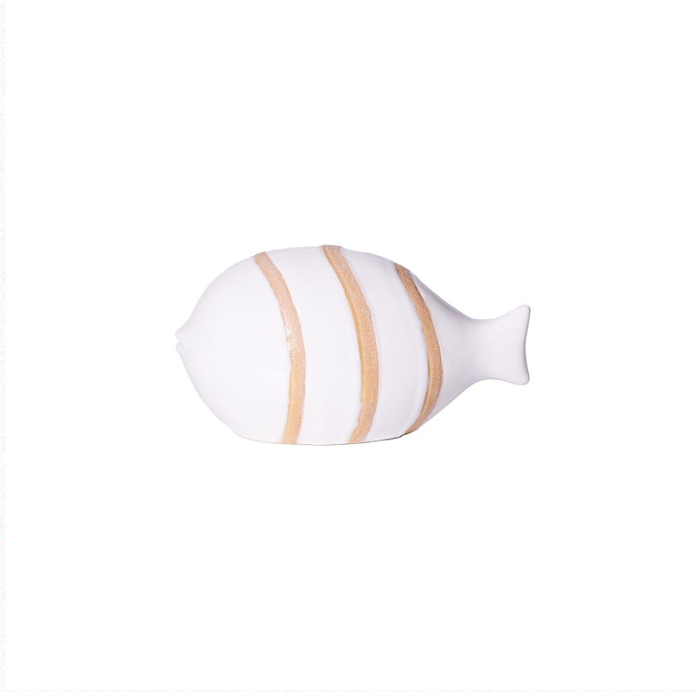 Decorazione in ceramica bianca e terracotta a forma di pesce con righe, disponibile in tre misure diverse. Molto bella come decorazione estiva per i vostri angoli di casa.