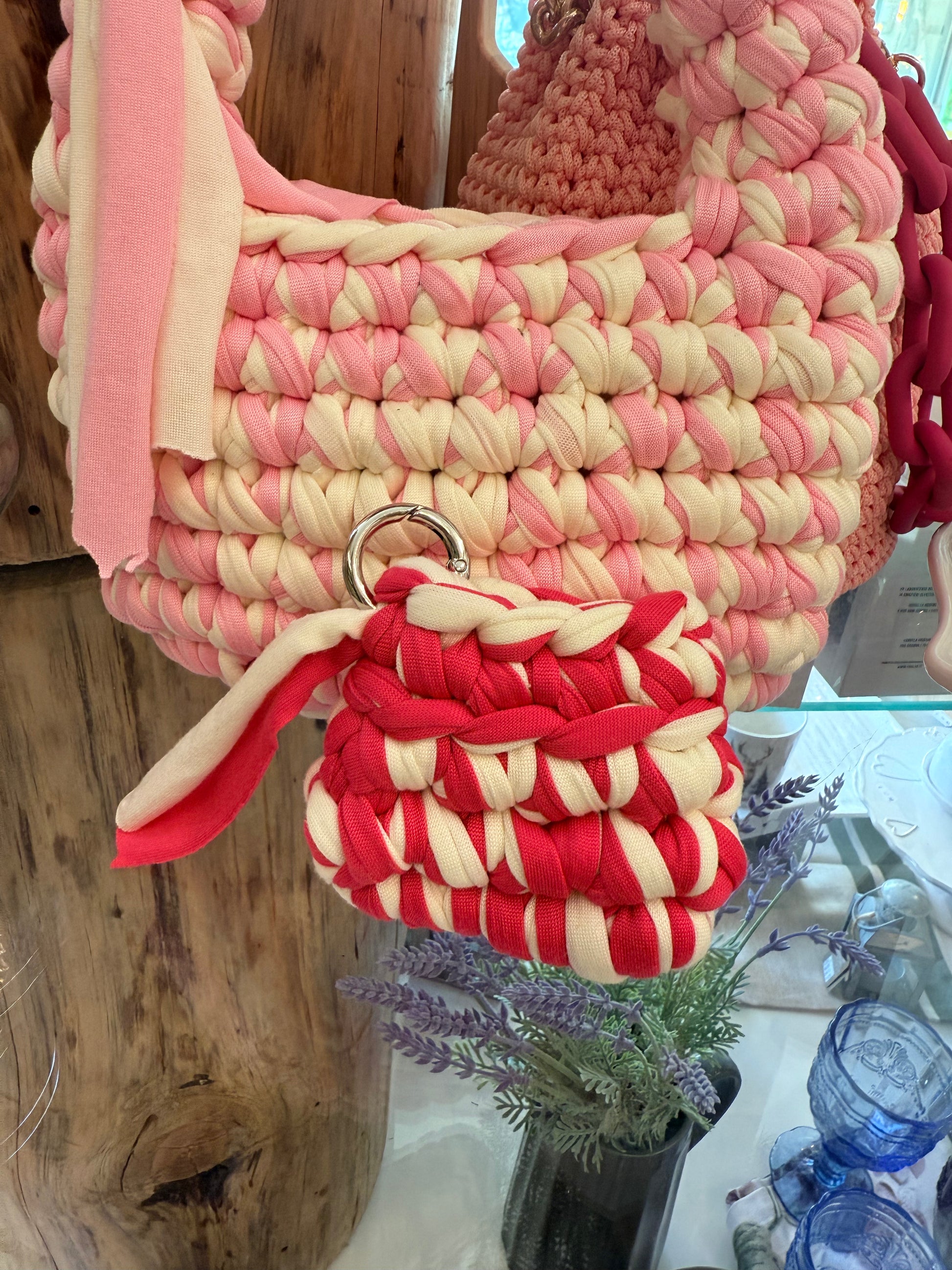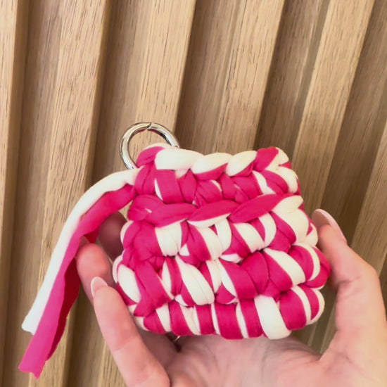 Aggiungi un tocco di stile al tuo outfit con questa porta airpods artigianale realizzata all'uncinetto in lycra nei vivaci toni del fucsia e bianco panna. Ogni pezzo è unico e lavorato a mano con cura e passione, per uno stile fresco, originale e sostenibile.