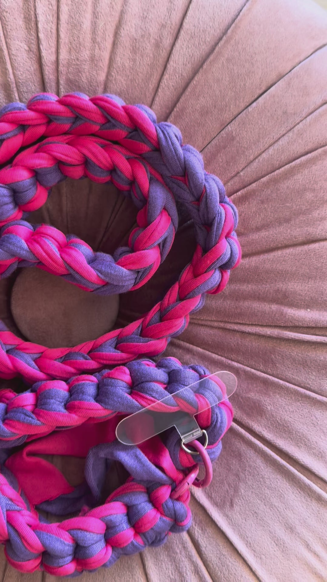 Aggiungi un tocco di stile al tuo outfit con questo porta cellulare artigianale realizzata all'uncinetto in lycra intrecciata dai toni del fucsia e viola. E' possibile portarlo al collo e a tracolla.Ogni pezzo è unico e lavorato a mano con cura e passione, per uno stile fresco, originale e sostenibile.