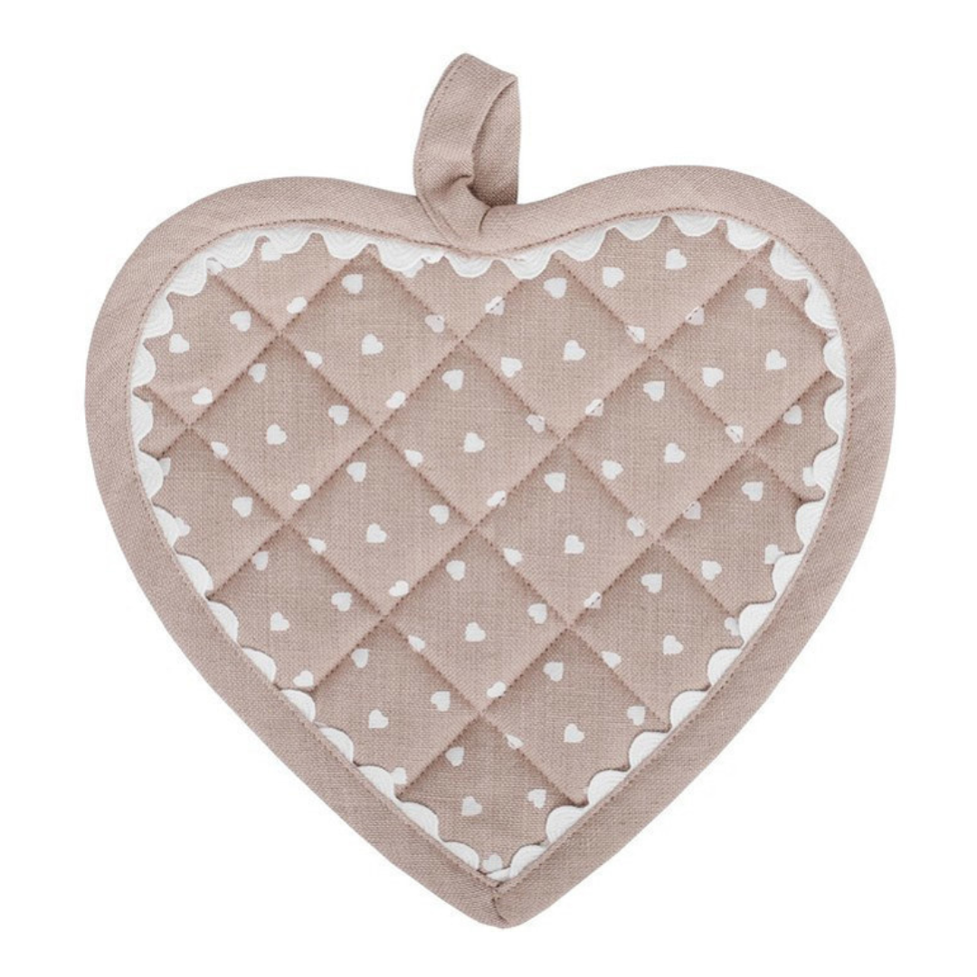 Presina a forma di cuore in 100% cotone, beige con cuoricini bianchi e merletto, compresa di pratico gancetto per appenderla.