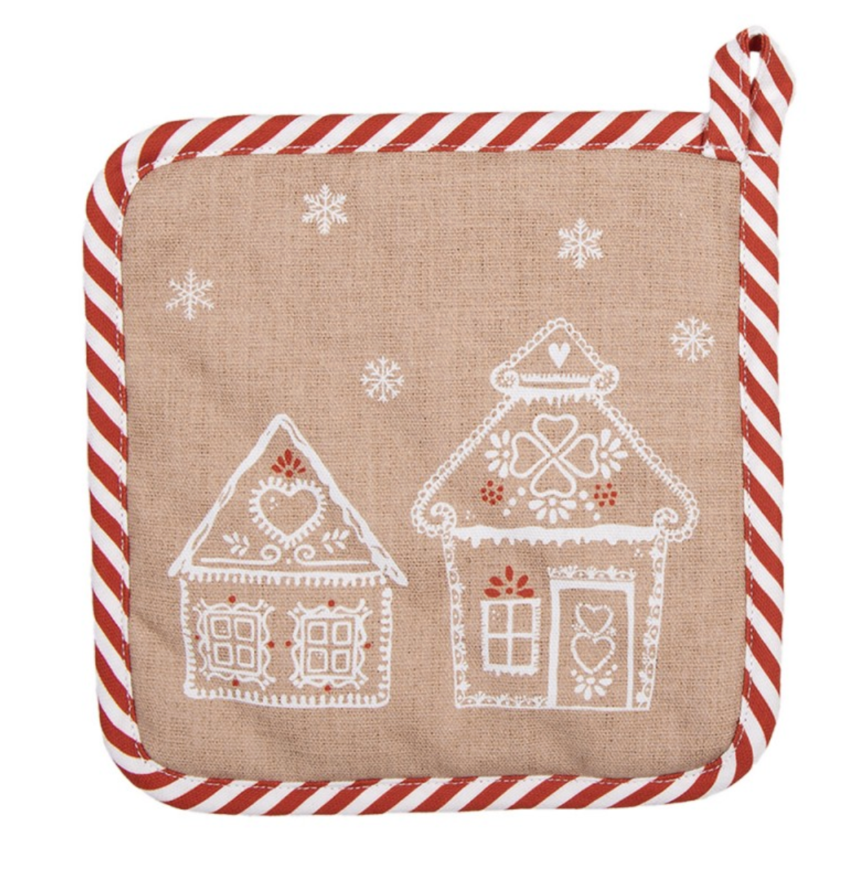 Bellissima presina da cucina in 100% cotone beige con un dolcissimo motivo di pan di zenzero e dotato di pratico gancio per riporlo. Bellissimo da abbinare con la sua linea tessile "Pan di Zenzero".