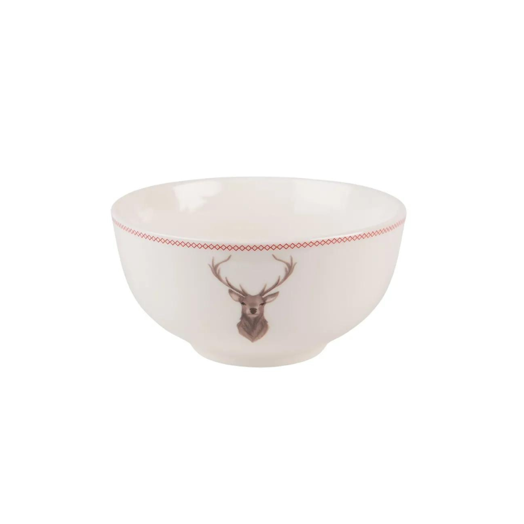 Scodella da colazione, zuppa, antipasti o verdure in porcellana bianca, bordo decorato rosso e con bellissima grafica di un cervo. La scodella è rotondo con un diametro di cm. 14. Ideale da abbinare con il bicchiere e il piattino della stessa linea "Cervo" e rendere la tua tavola molto coccola.
