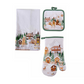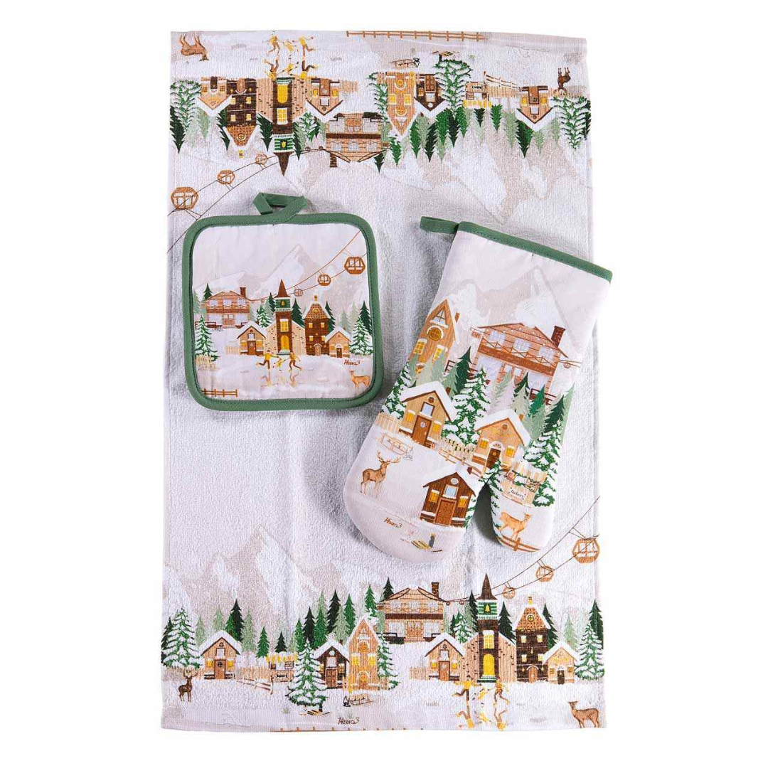Set composto da morbido asciugamano in cotone, presina e guantone con fantasia "Winter Village" e bordo verde. La stampa ricorda un paesaggio innevato di montagna con renne e pista di pattinaggio sul ghiaccio. Ideale per decorare la vostra cucina o come idea regalo.