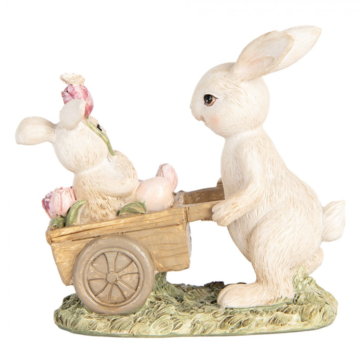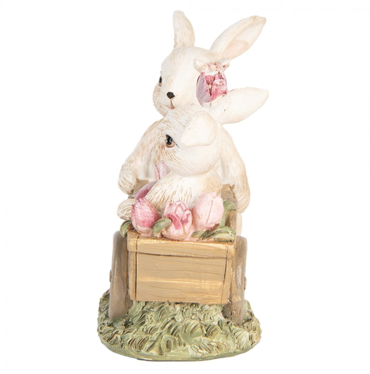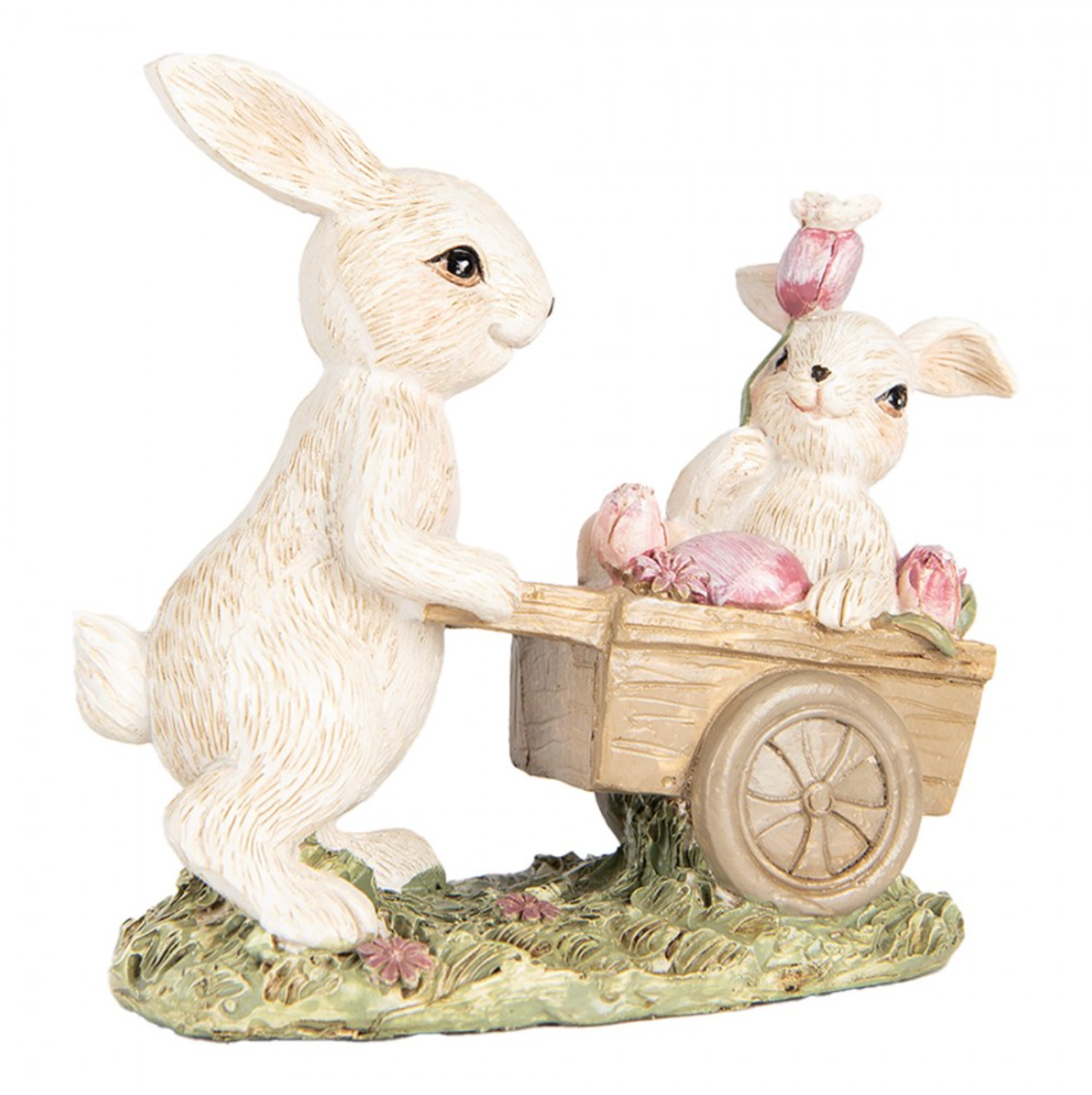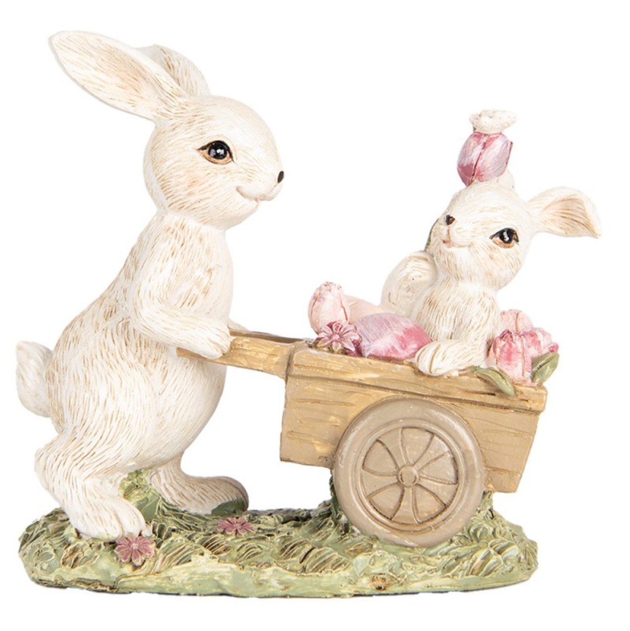 Statuetta decorativa con tenerissimi coniglietti bianchi in carriola con dettagli floreali rosa e farfalla. Ideale per aggiungere un tocco incantevole alla tua casa.
