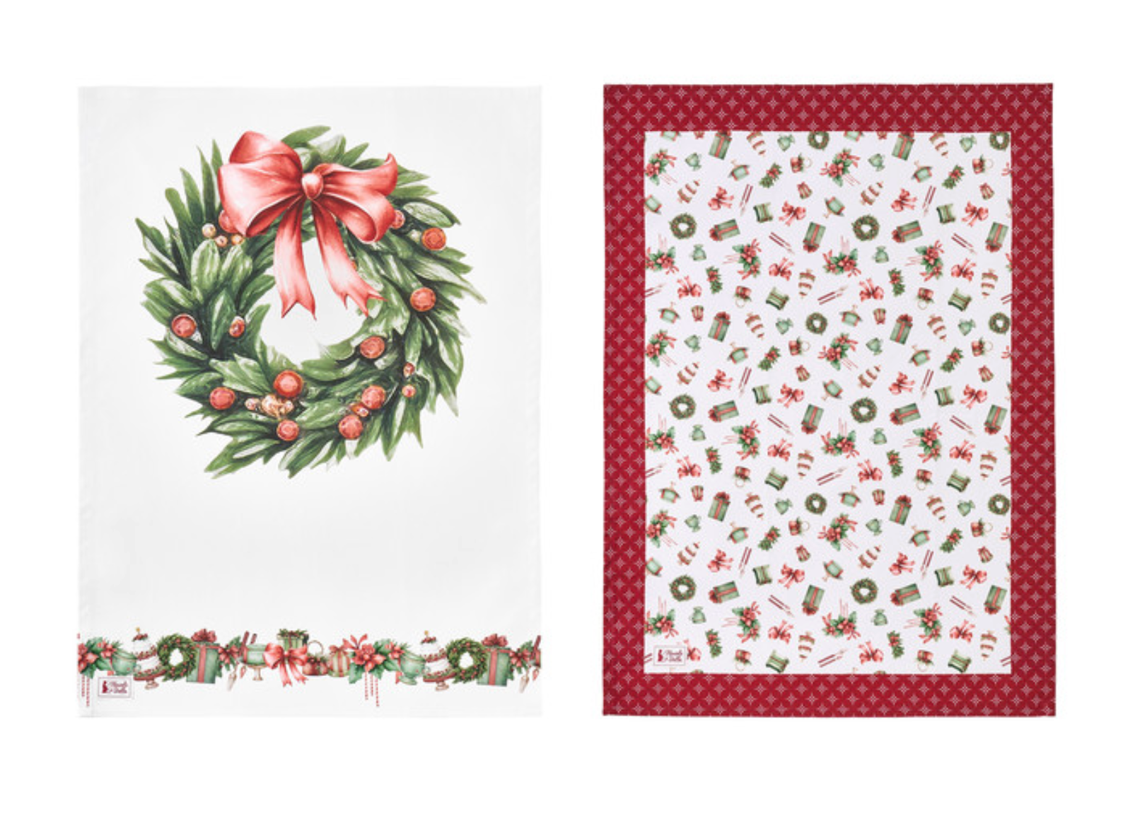 Bellissimi strofinacci in cotone con due diverse fantasie: una multipla con elementi natalizi ricca di regali, una bellissima torta, decorazioni floreali e fiocchi; ed una con una bellissima ghirlanda natalizia. Un design perfetto che ricorda l'atmosfera magica di Natale.
