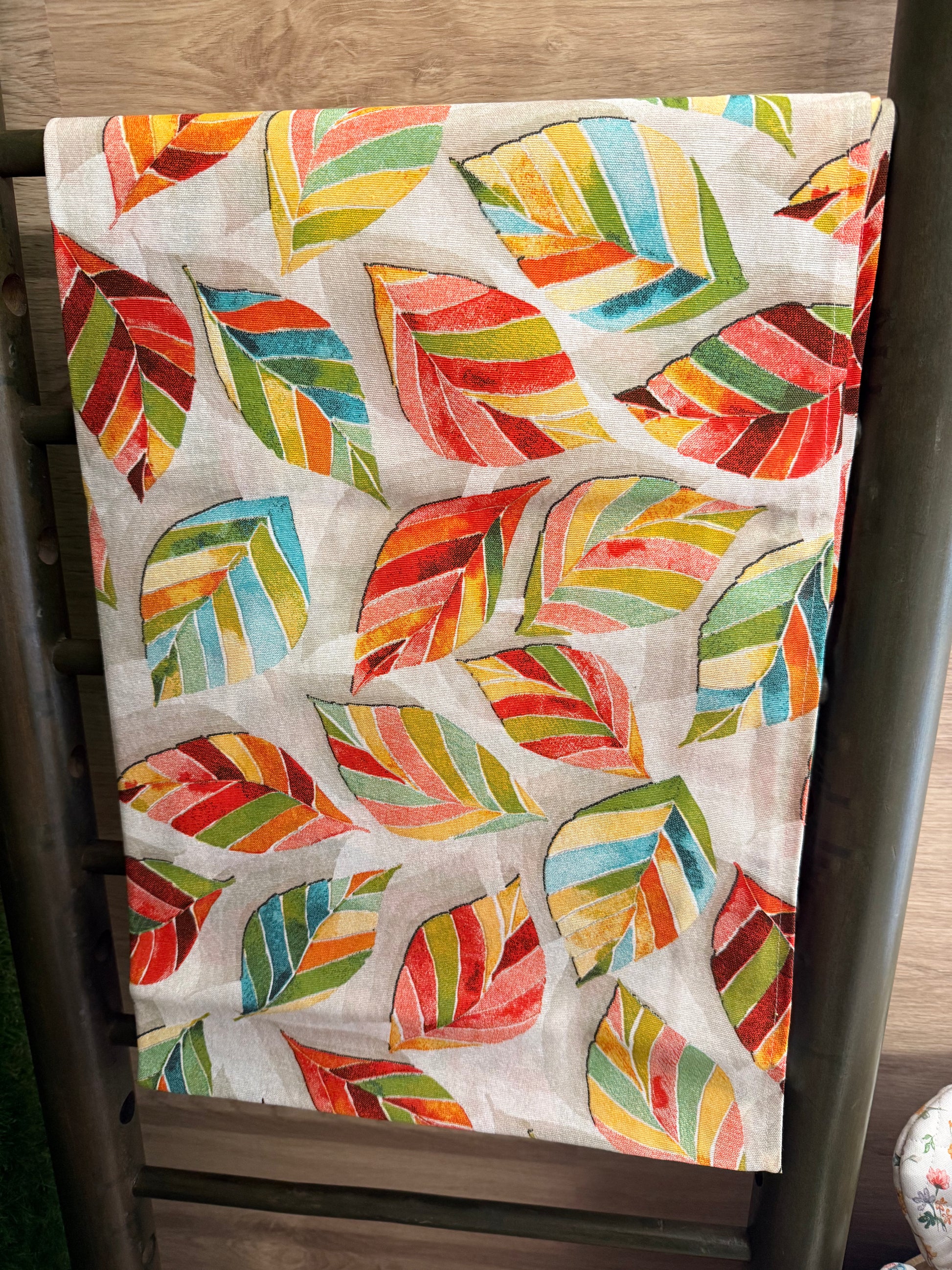 Tovaglia con stampa multipla di foglie colorate e sfondo neutro. Disponibile in 2 misure: da 6 persone e da 8 persone.