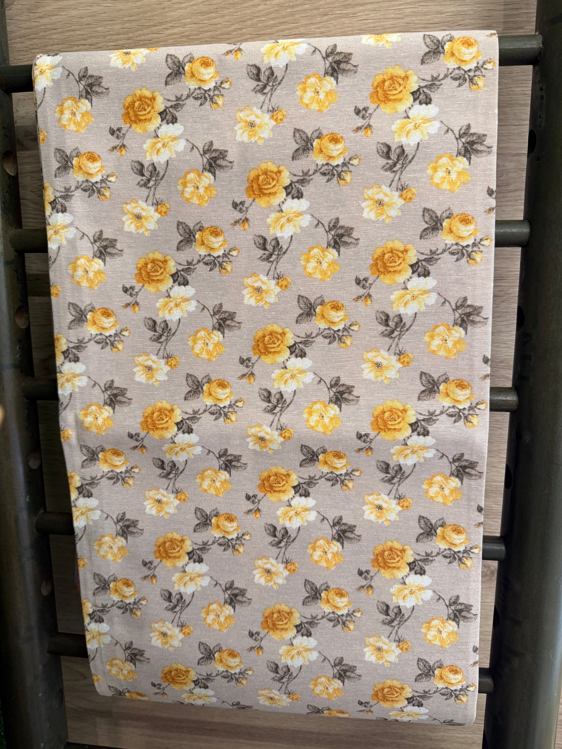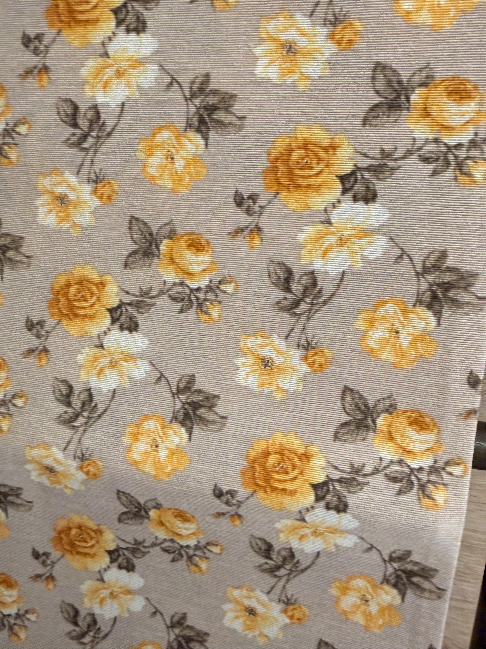 Tovaglia con stampa multipla di roselline gialle e sfondo neutro. Disponibile in 2 misure: da 6 persone e da 8 persone.