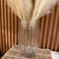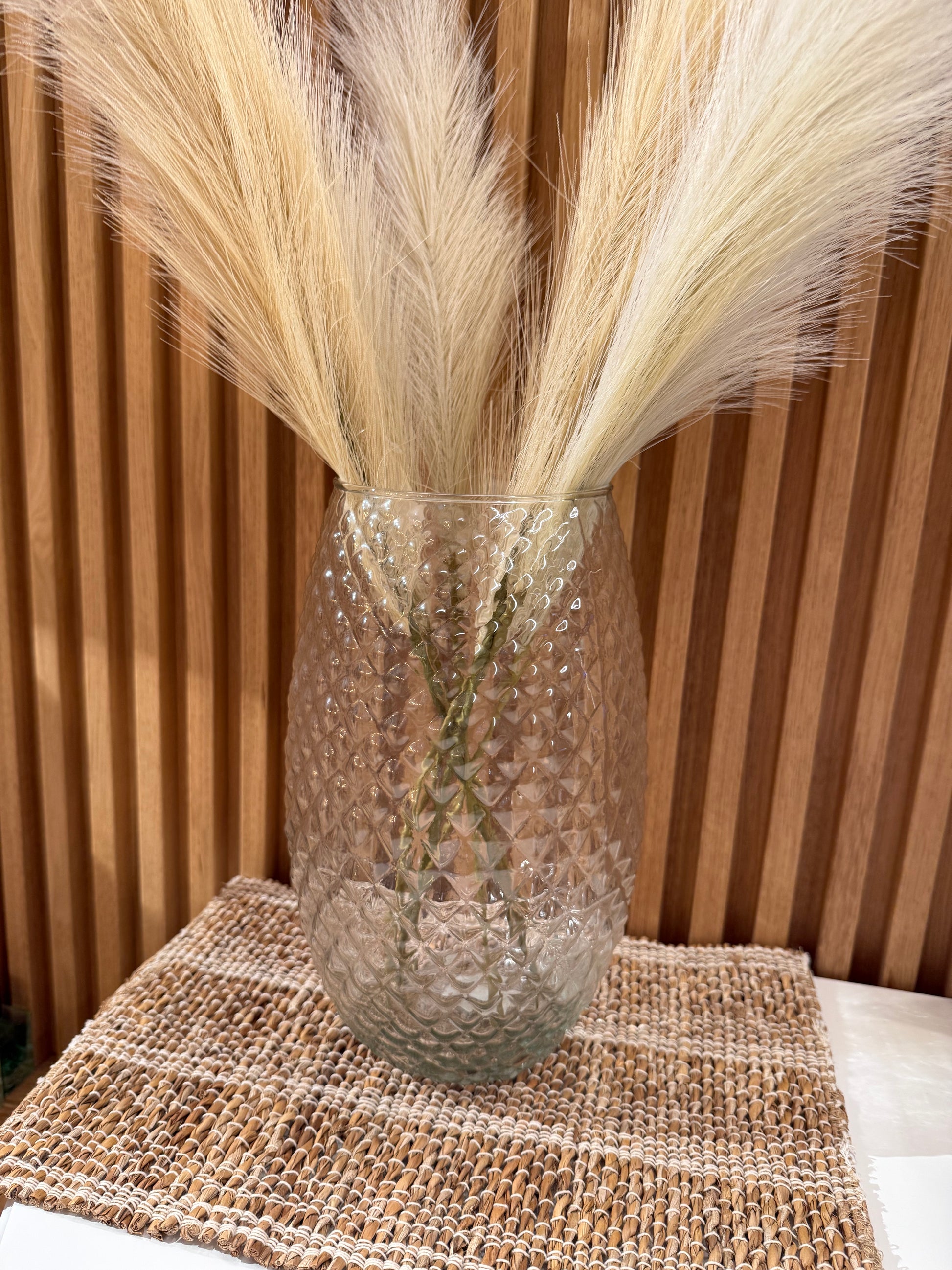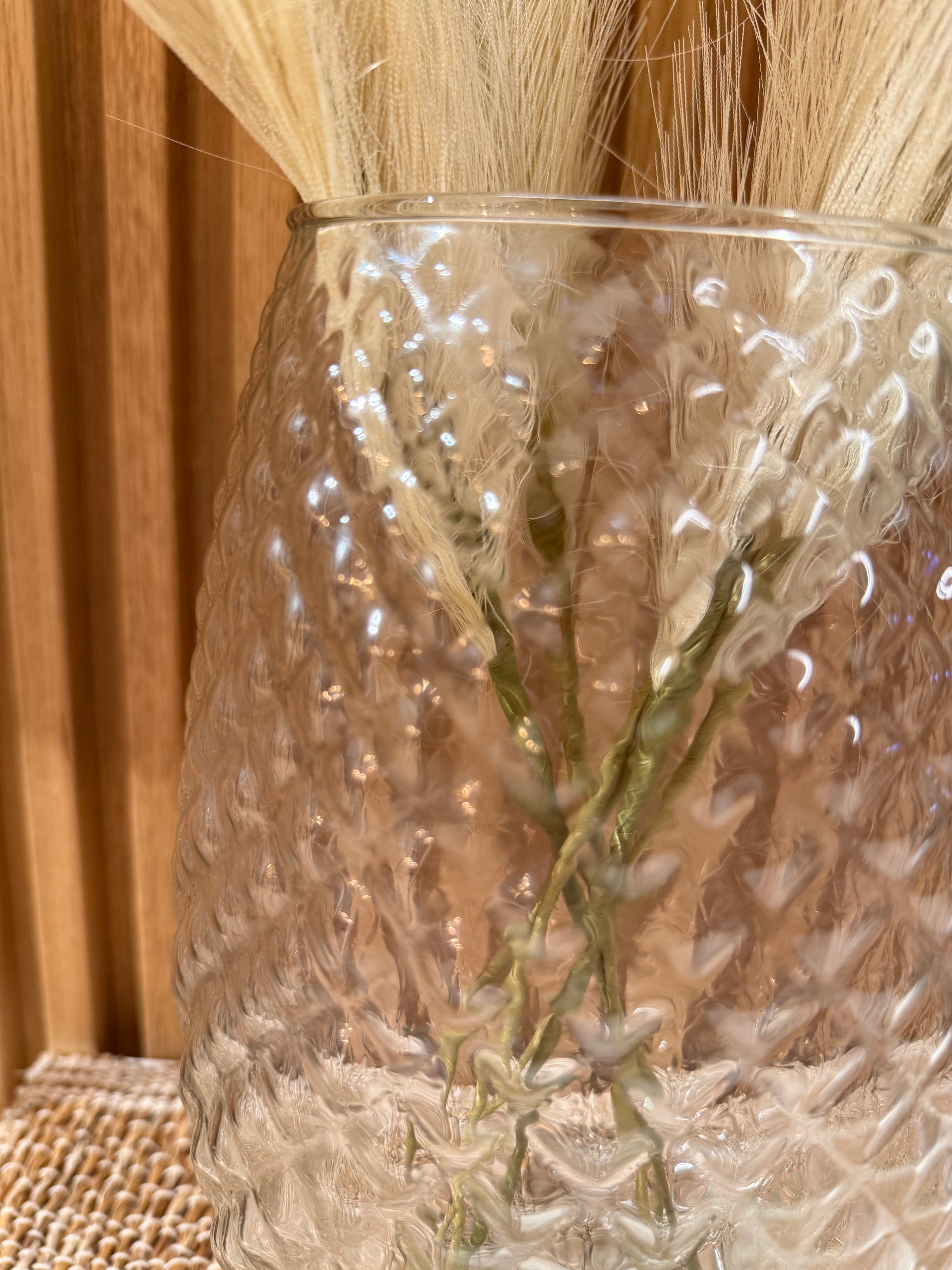 Vaso in vetro a forma di cilindrica con decorazioni in rilievo. Ideale per i mazzi di fiori, semplice ed elegante.