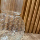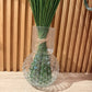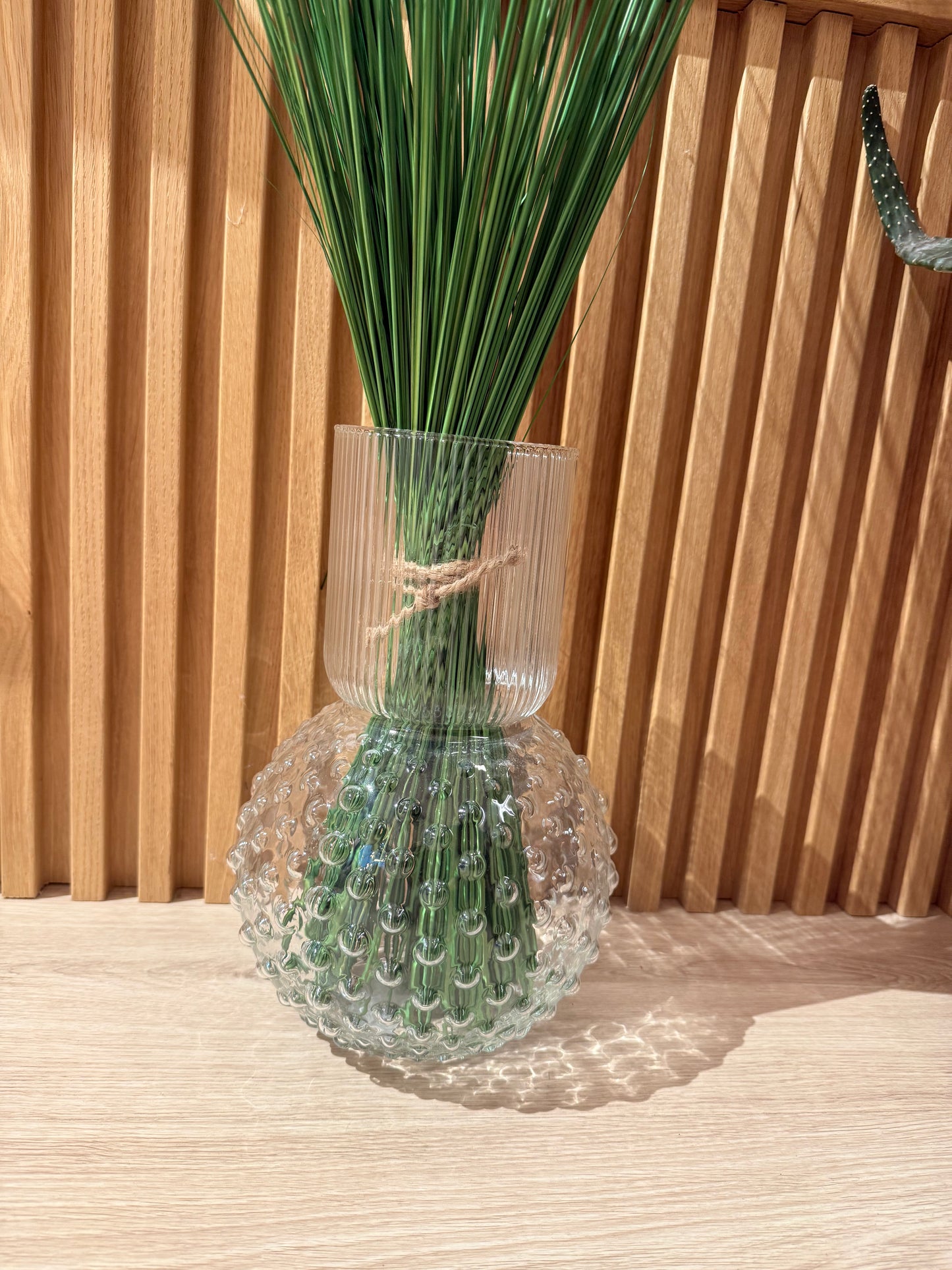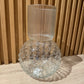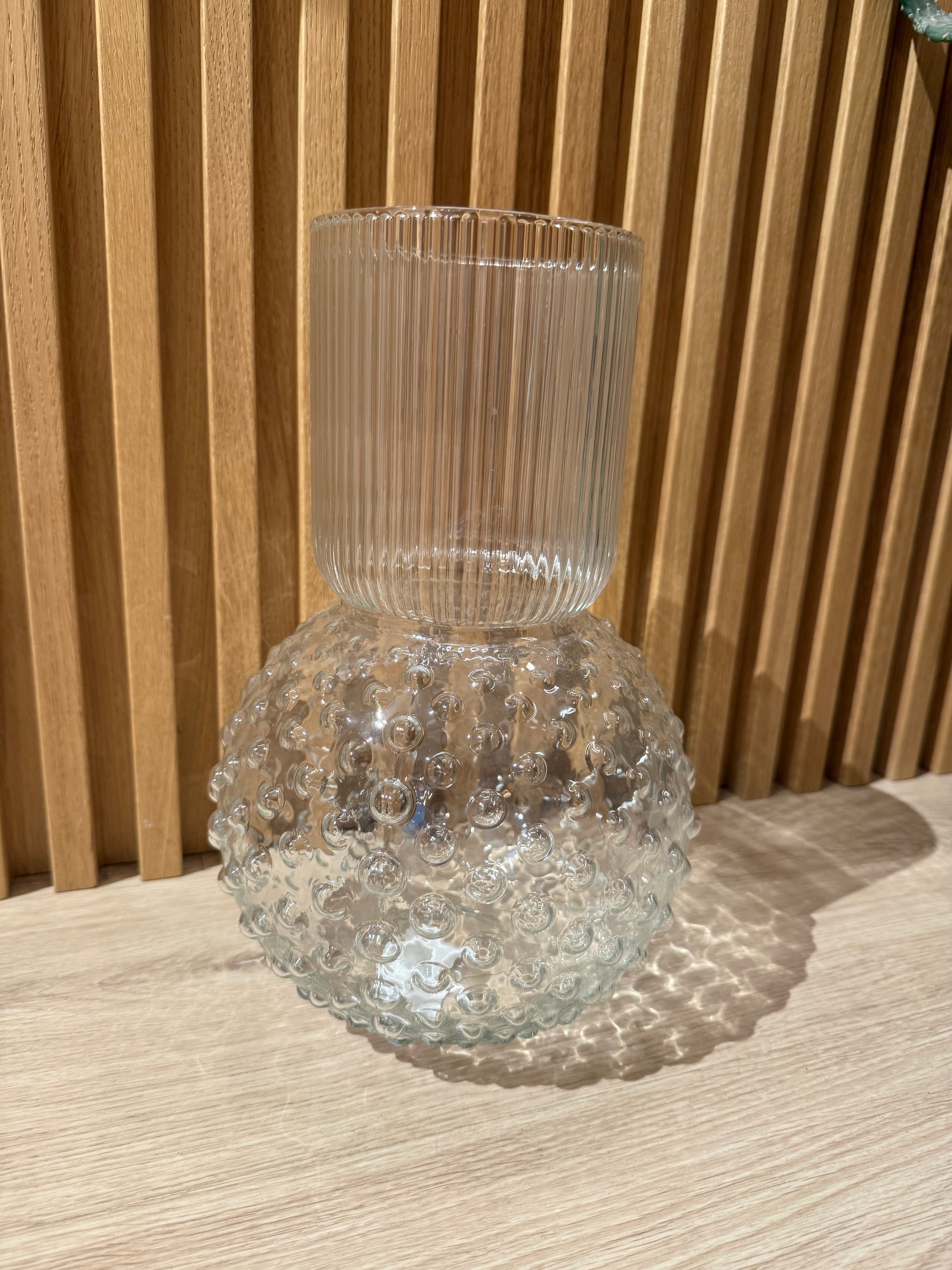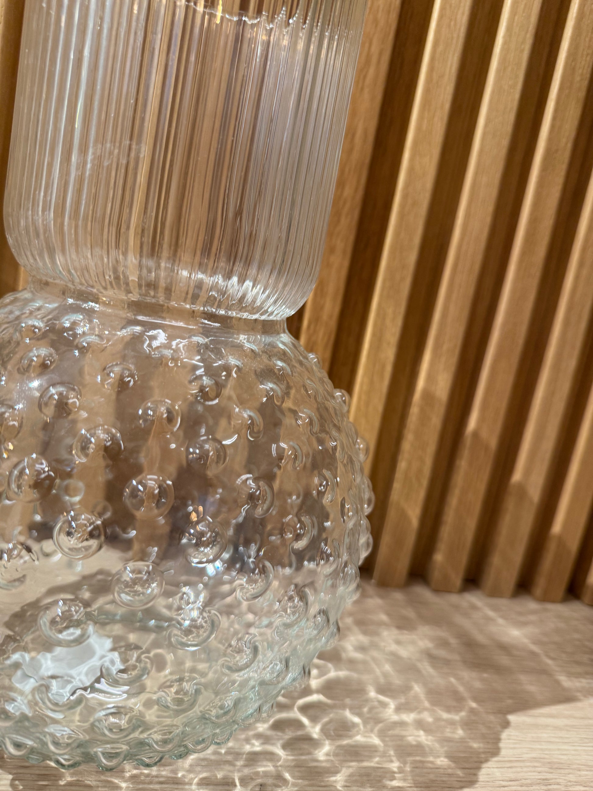 Vaso in vetro a forma di sfera con pois in rilievo e sulla parte lunga ad effetto a righe sempre in rilievo. Ideale per i mazzi di fiori.